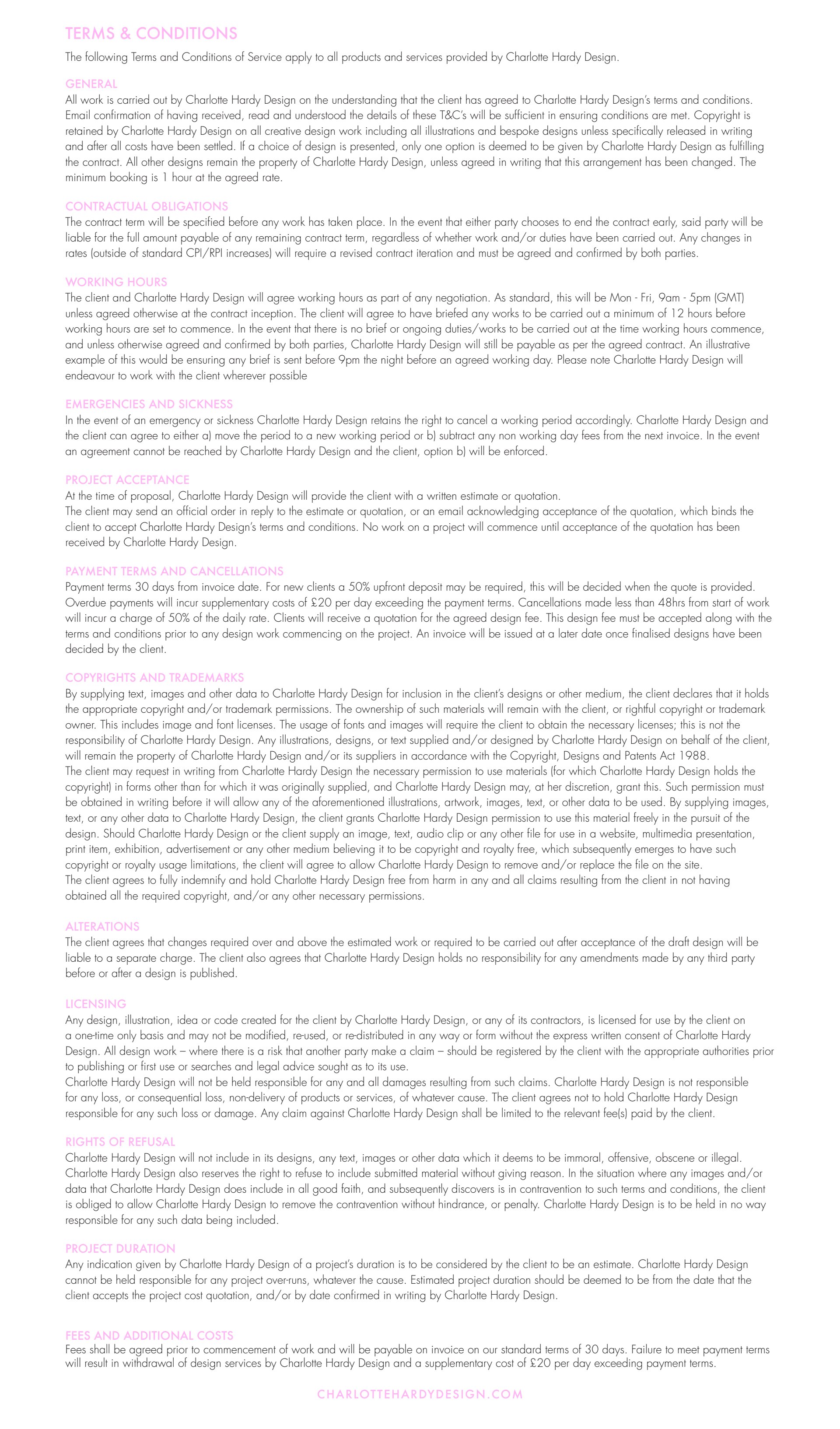 If you are a new client and have any queries on the above please contact me on charlottelucyhardy@gmail.com with the subject line ‘T&Cs’